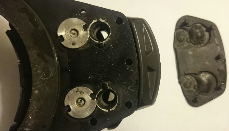 Подозреваю, из-за этого (в том числе) происходило разрушение "пистонов", в которые вкручиваются винты платформ. Для устранения этого были пересверлены базы креплений (новые отверстия на 15 мм ближе к центру крепления). Пластиковая накладка тоже просверлена.