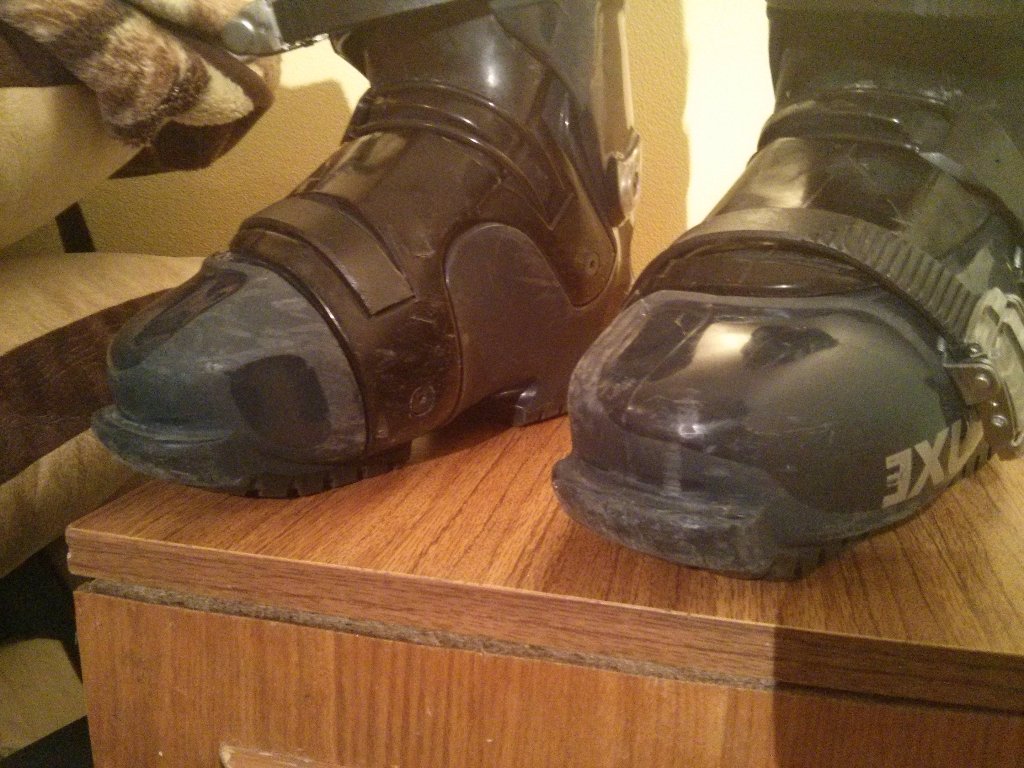 Состояние хорошее. Всё работает. Есть потёртости на пластике. Самую малость сточен уголок пяточного зацепа на одном ботинке.