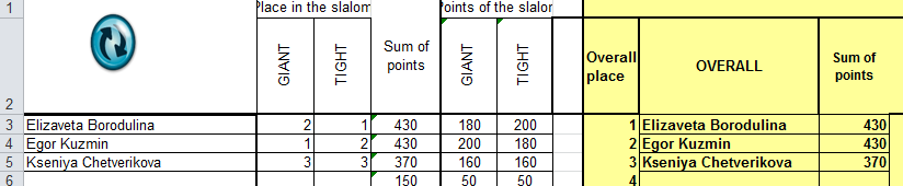 при равенстве очков по умолчанию вперед идет тот, кто занял более высокое место в последней дисциплине.