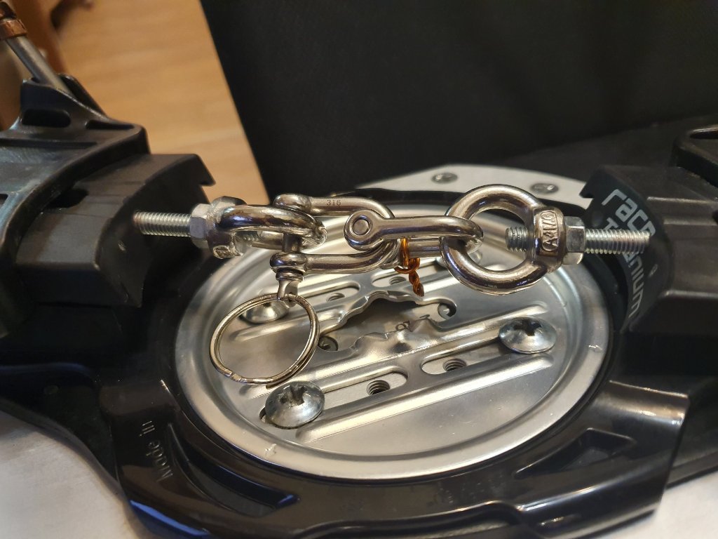 Регулировка контрящих рым-гайки болтов осуществляется таким образом, чтобы не было зазора в скобах, там нет никакого преднатяжения, поэтому болты ничего не стягивает в отсутствии ботинка. Когда ботинок зажат в креплениях - болты также остаются в нейтральной позиции, потому что в системе шаклов зазора нет и она берет на себя всю нагрузку от застежек, а сами металлические шаклы очень жесткие на растяжение.