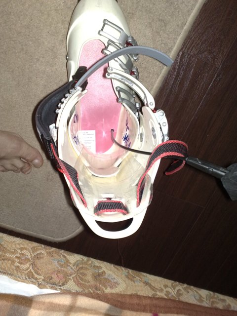 В ботинок вырезал и вложил (приклеив двусторонним скотчем) пластиковые стельки, закрывшие все неровности, закладные гайки заклеил скотчем, торчащий задник мыльницы сверху накрыл куском ПЭТ-бутылки от кокаколы, прикреплённой к голенищу. Чтобы ботинок не бегал по полу при всовывании в него ноги, пристегнул его к доске Внутренник изрядно впечатлил своей мягкостью после разогрева :) Всё натянулось идеально, поверх одел нейлоновый гольф, сжавший всю конструкцию.