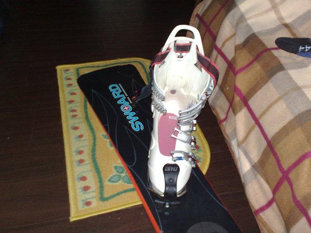 Чтобы ботинок не бегал по полу при всовывании в него ноги, пристегнул его к доске