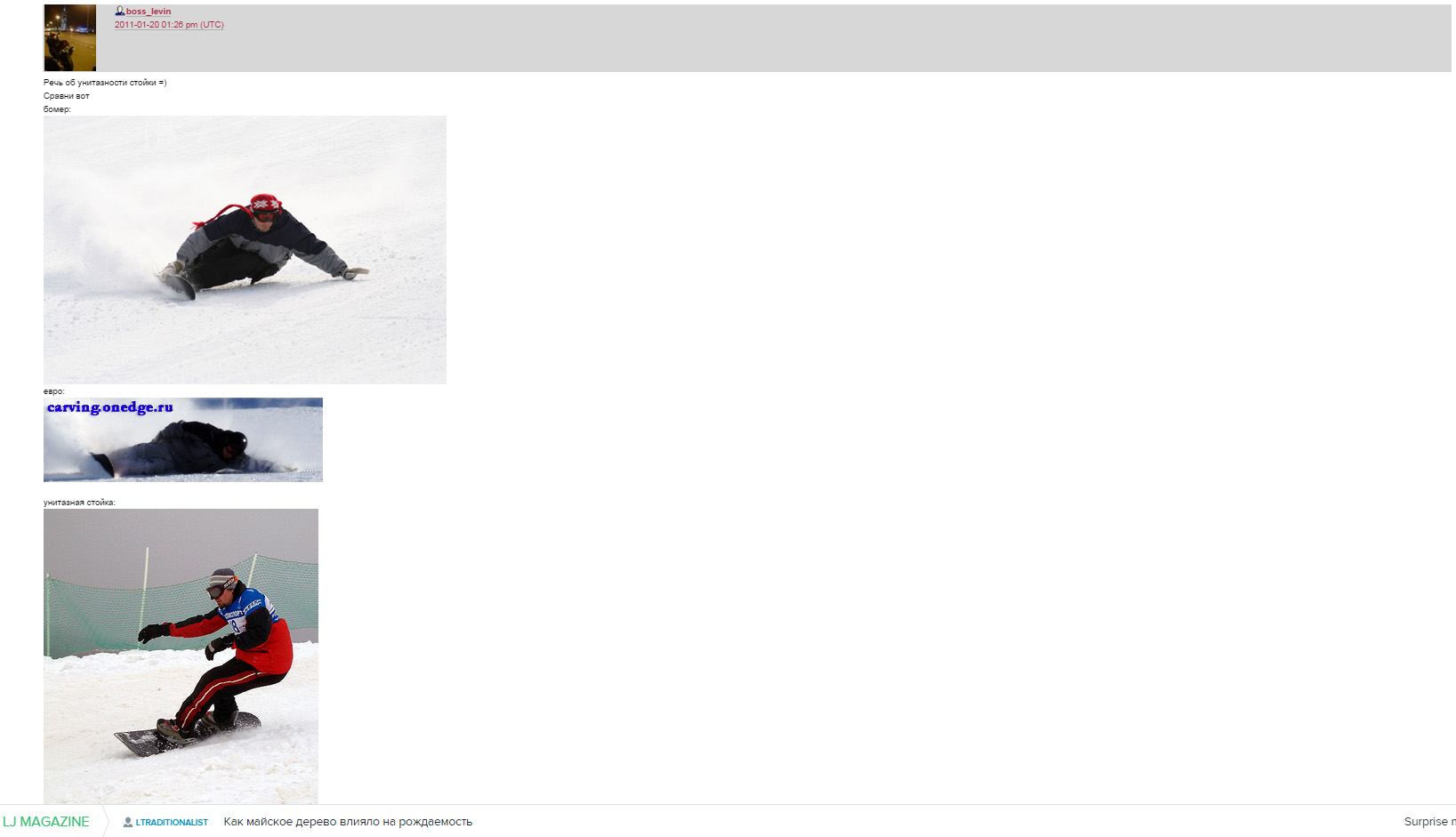 Для меня в его посте важным было то, что среднестатистический сферический "продвинутый райдер" знакомый с понятием "карвинг" понимает под "унитазной стойкой". Я сразу вспомнил видео Фивата, нарезал оттуда 3 кадра с похожей позой и сделал иронический коллаж, потому что задница - такая анатомическая штука, которую не убрать при всем желании. Вот такая шутка-штука.