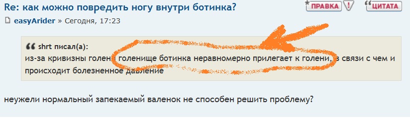 неужели нормальный запекаемый валенок не способен решить проблему?shrt писал(а):из-за кривизны голени голенище ботинка неравномерно прилегает к голени, в связи с чем и происходит болезненное давление