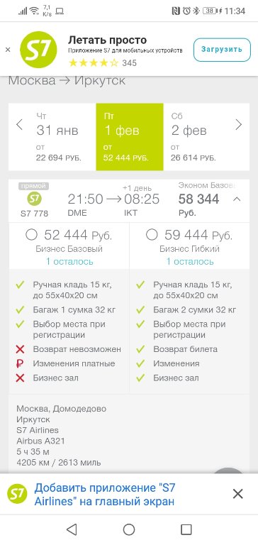 обычные билеты подорожали на 66 (АФ) и 54 (S7) руб.