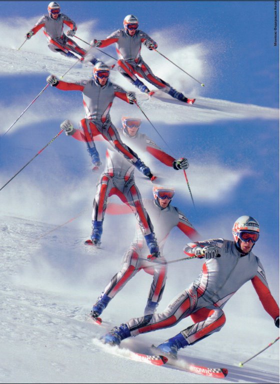 Вторая неточность в этой гипотетической инструкции — неверная последовательность событий. После того как лыжник встал (распрямил ноги), на его лыжи давит все тот же вес, препятствующий развороту или смещению лыж относительно тела. Изменение давления на лыжи происходит в процессе разгибания, а именно в первый же момент после завершения движения. Значит, и поворачивать или смещать лыжи следует практически одновременно с разгибанием ног. Описанный выше способ разгрузки называется разгрузкой вверх и используется спортсменами уже очень и очень давно. Однако разгрузка вверх в исполнении спортсменов высокого уровня сильно видоизменилась. Во-первых, разворот лыж практически отсутствует и, соответственно, лыжи должны быть разгружены в меньшей мере. Основная цель разгрузки — это «отпускание» кантов. Для обеспечения этого достаточно меньшего диапазона сгибания-разгибания ног при более высокой интенсивности движений. Нужно отметить, что разгибание идет не только вверх и вперед, но и в сторону, в направлении центра следующего поворота. Таким образом, создаётся впечатление, что ноги движутся под телом подобно маятнику и никакой разгрузки в привычной для нас форме не происходит.