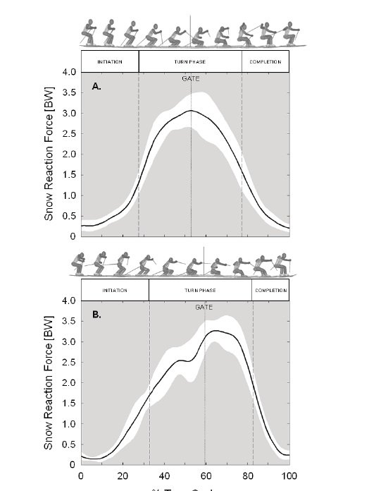 Кстати, вот график давления на лыжи в повороте,с разгрузкой вниз и загрузкой вверх, по трассе с воротами через 11 и 13 метров