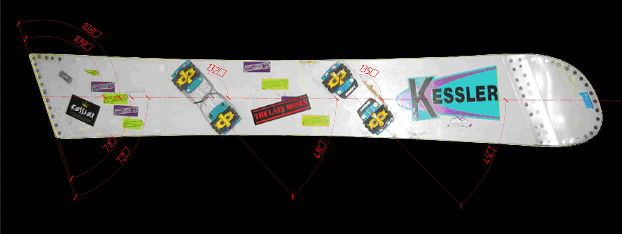 смотрите: углы установки креп отличаются от угла смещения бокового выреза доски по продольной оси , при том, что сплайном обрисованый по фото край (один) отзеркален на противоположную сторону со смещением(лег как влитой). То есть, на этом ассиметрике работа на переднем и заднем канте не симметрична относительно общей симметрии... ну как то так...
