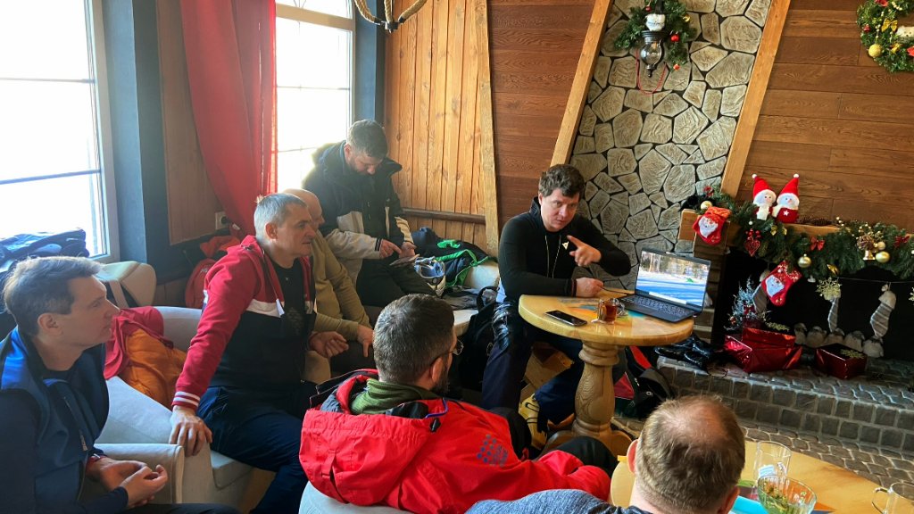 - 24 декабря, суббота: заезд с 14:00, размещение, встречаемся около 17:00 в «Ангаре горнолыжника», знакомство + ужин, вечерняя тренировка.