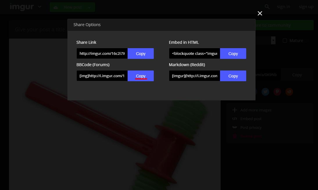1. Нажимаем кнопку "New post" 2. Перетаскиваем фотки в окно барузера, либо находим файлы через кнопку Browse: 3. Получаем ссылки - "Get share links": 4. Копируем готовый bbcode: 5. Вставляем скопированный код в текст сообщения.