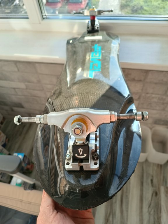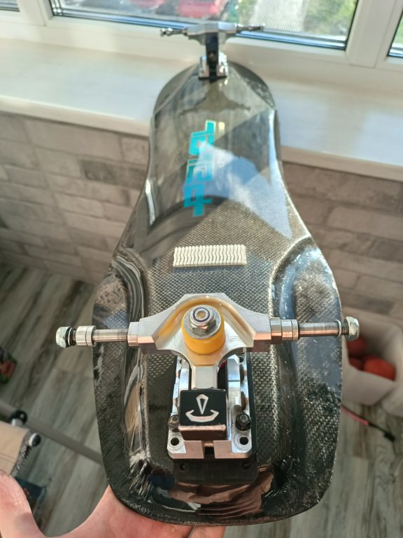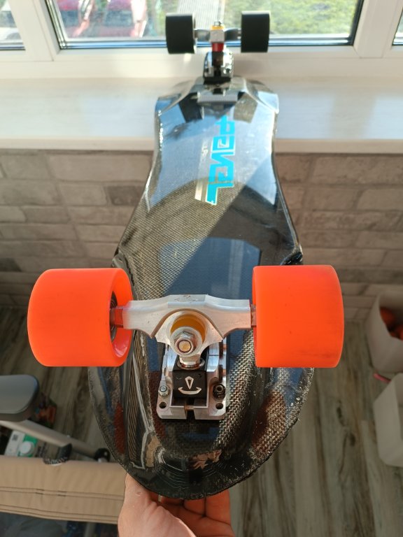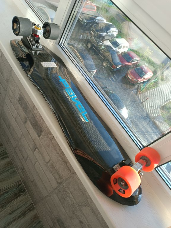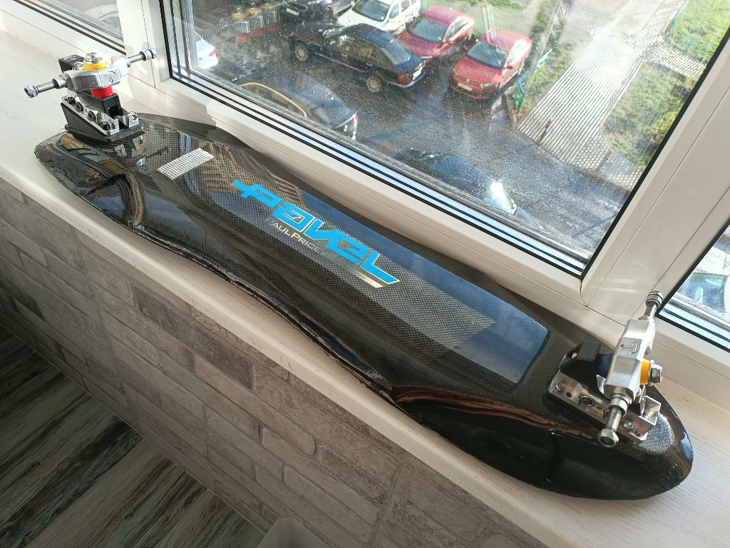 Итак, кастомная дека от немецкого производителя, известного своим высоким качеством - Pavel Skates. Карбон, стекло, дерево, сверху - износостойкий ламинат. Продольно и торсионно жёсткая. Красивая. Приятно брать в руки, не похожа на самоделку. База гибридная - 21 и 22"(63см по колёсным осям максимум) - для сложных техничных трасс на плоскости.