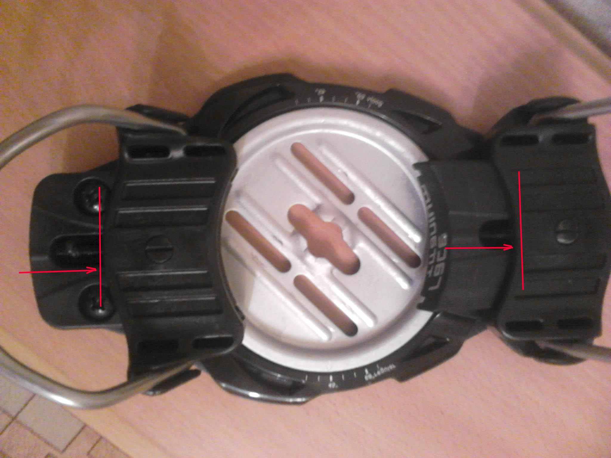 Если просто хочется чтобы платформы были выдвинуты симметрично - можно поставить диск прорезями поперек (и просверлить 2 доп. отверстия в базе крепления чтобы переставить одну платформу, если хода не хватает чтобы нормально зажать бот). Тогда платформы будут выдвинуты примерно одинаково, но метка ботинка не будет по центру креп и центр креп не будет на продольной оси доски. Но зачем это делать если ботинок и так зажимается нормально и удается его отцентровать ?