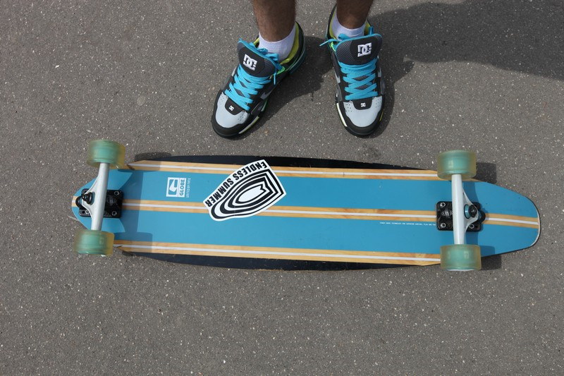 Продаю лонгборд Globe. Размеры: 9.5" x 38". Колесная база - 26". Слоеный шпон, всего 6 слоев. Верхний и нижний слои доски выполнены из фибергласа (стекловолокна). Подвески: Slant Magnesium inverted, 150мм. Колеса: 70мм / 78a Mushroom Core. Подшипники: Abec7. Доска имеет обратный прогиб; с длинным загнутым тэйлом; есть небольшой конкейв. Доска гнется. Катался на нем недолго, почти новый.