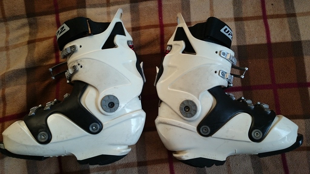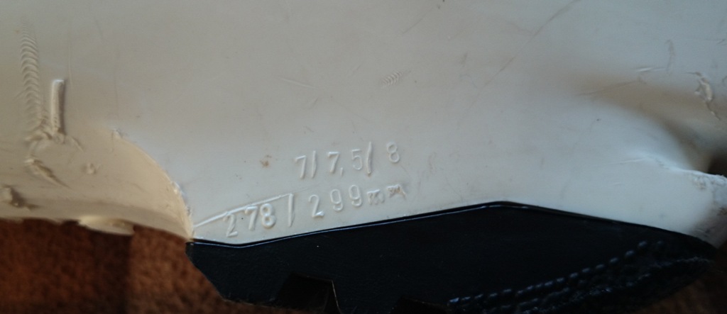 На левом (переднем) ботинке слегка потёрта предняя клипса (лягушка от Катека постаралась), на правом (заднем) - следы перестановки нижней гребенки голенища (отверстия), нижней клипсы (заклёпка заменена на винт), третьей гребёнки языка (отверстие) - боролся с задеваниями 3 и 4 клипс.