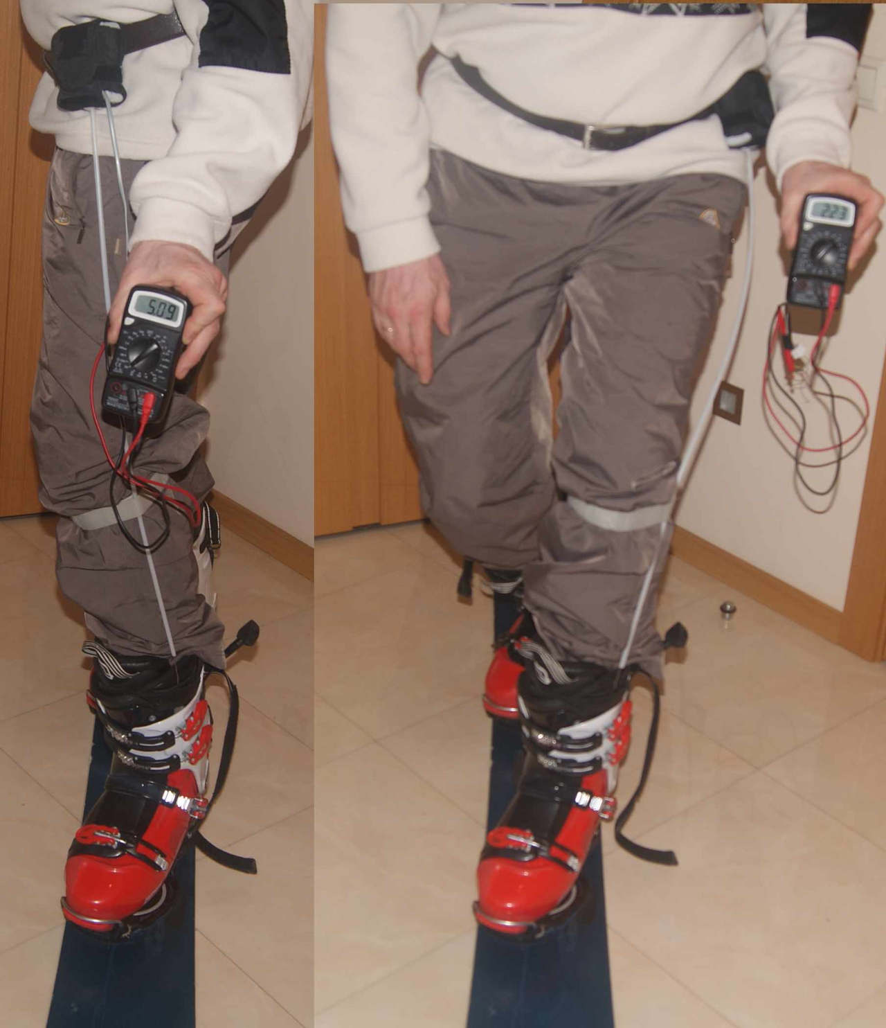 Если один конец тросика прикрепить к доске, а другой — к датчику, кинематически жестко связанному с бедрами (тазом), то скручивающее тросик усилие будет пропорционально углу поворота бедер относительно доски.