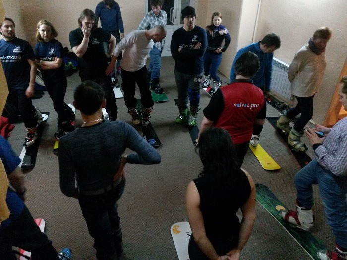 Спасиб за фото :smile: ! Счастливые и одухотворенные лица, солнце и море снега, фан и драйв в катании/тренировках . Все по фэншую и внушает :ok: -- все в шлемах, только один дядечка попал на фото и на склоне/в райде в шапке-ушанке, впрочем, это чей-то выбор :popcorm2: :dont_know: ! И девушка в "декольте"-- доска на полу, точка кантов вручную, единение с дозкой бесценно :good: !