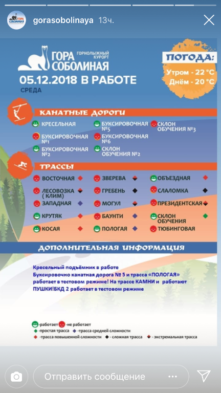 Завтра будем там, напишу. А вообще они в своём инстаграме каждый день пишут актуальную информацию по работающим подъемникам и трассам. Вчера, например, уже работали крутяк, объездная, косая и пологая