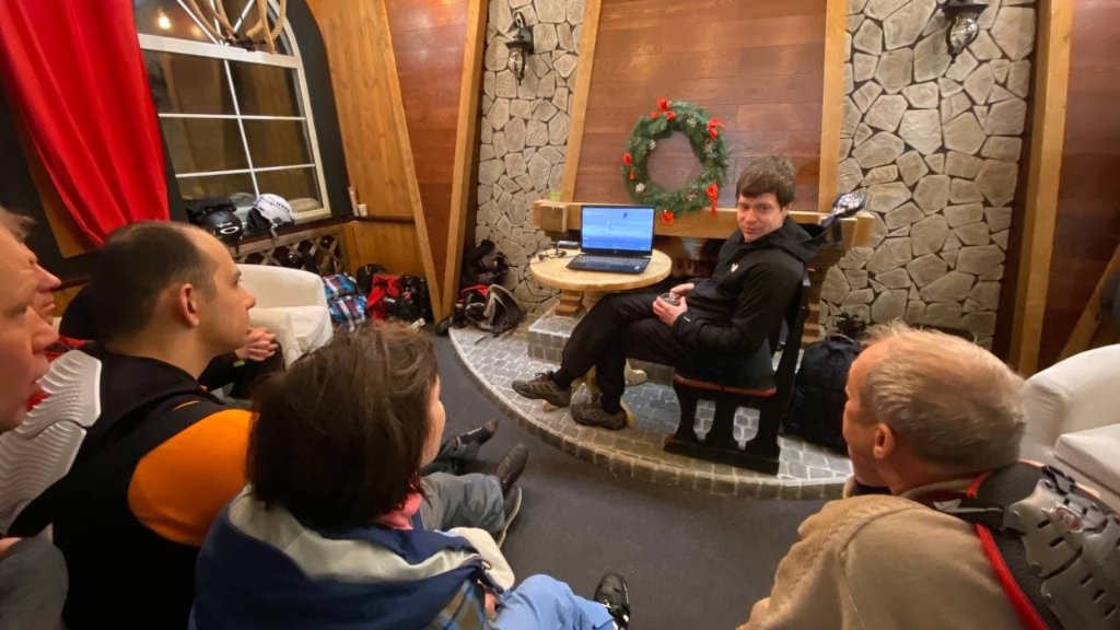 - 19 декабря, суббота: встречаемся в «Ангаре горнолыжника» за завтраком в 9:00, знакомимся, разминаемся и идем на гору.