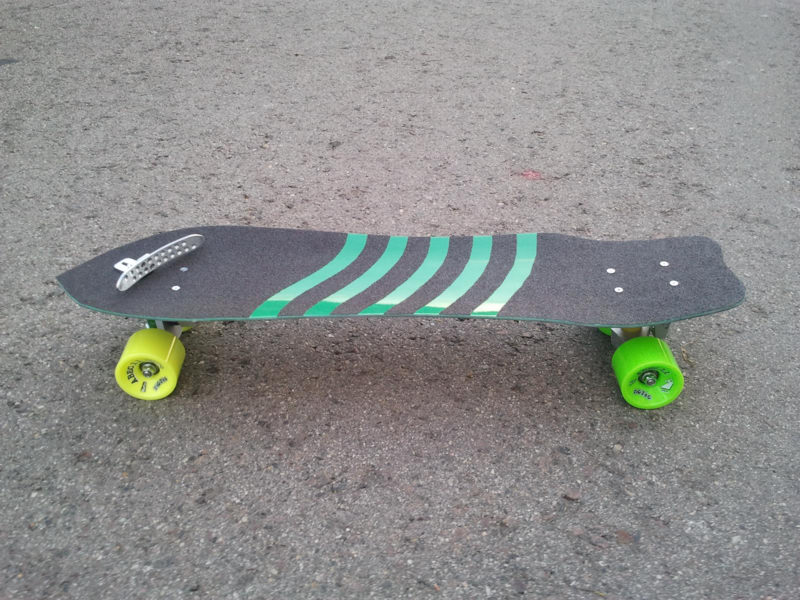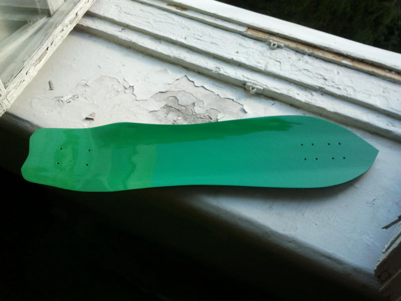 Сгонял в автомагазин, купил три аэрозоля: бесцветный акриловый лак, белую и зелёную акриловые эмали, бумажный респиратор. Обклеил низ доски полиэтиленом, чуток зашкурил шпон и нанёс пару слоёв бесцветного лака для грунтовки. Затем, для того, чтобы искомый цвет был ярче и насыщеннее, нанёс несколько слоёв белой эмали. Подождал полчаса, пока высохнет - эмали сохнут моментально, слои наносятся с перерывом в 2-3 минуты. Зашкурил нулёвкой и нанёс несколько слоёв ярко-зелёной эмали. Подождал пока высохнет, снова аккуратно зашкурил и нанёс несколько слоёв бесцветного акрилового лака. Сушил двое суток, в итоге получилась глянцевая конфетка: А в сборе - отлично едущий топовый комплект: В итоге имеем яркий и выразительный внешний вид, радующий глаз, при минимуме затрат (банка эмали - 130р.).
