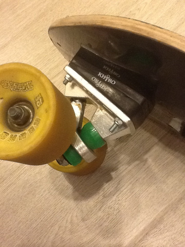 Скейт из широкой скейтербилдовской деки, модифицированных подвесок, спереди беннетт 100мм со сфериком, сзади - рандалл 100мм.