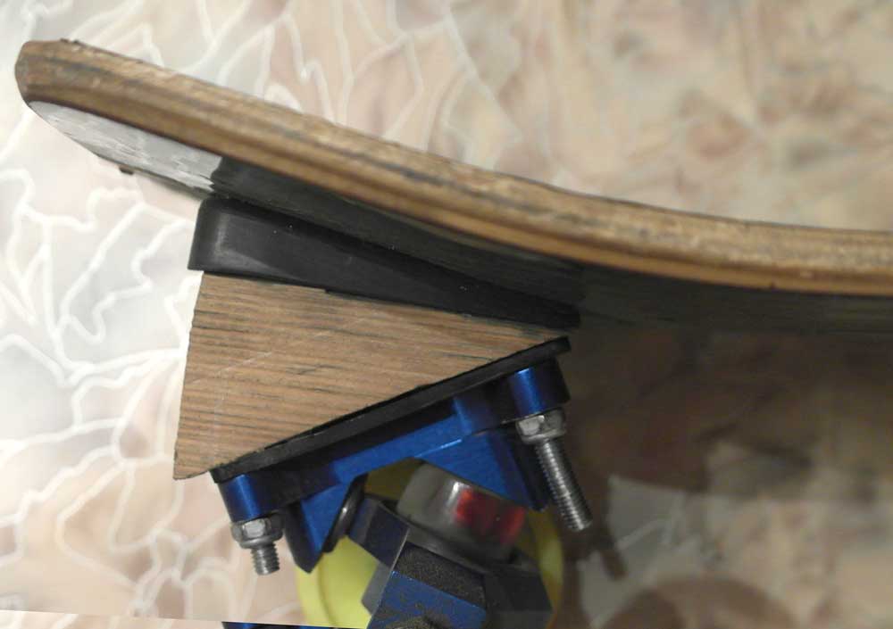 ну тут можно поступить просто - перевернуть задний трак, чтобы он пивотом внутрь деки смотрел, и тогда клин не понадобится, ну и база увеличится