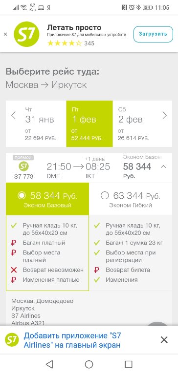 обычные билеты подорожали на 66 (АФ) и 54 (S7) руб.