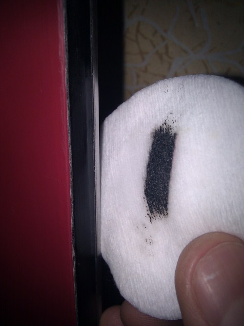 Я на лето канты у досок смазываю rust-stop-ом (это такой жиденький антикор против ржавления). Дык он него эта черно-серая полоска мажется и пачкается. Больше она похожа на какую-то графитовую сильно загущенную массу.