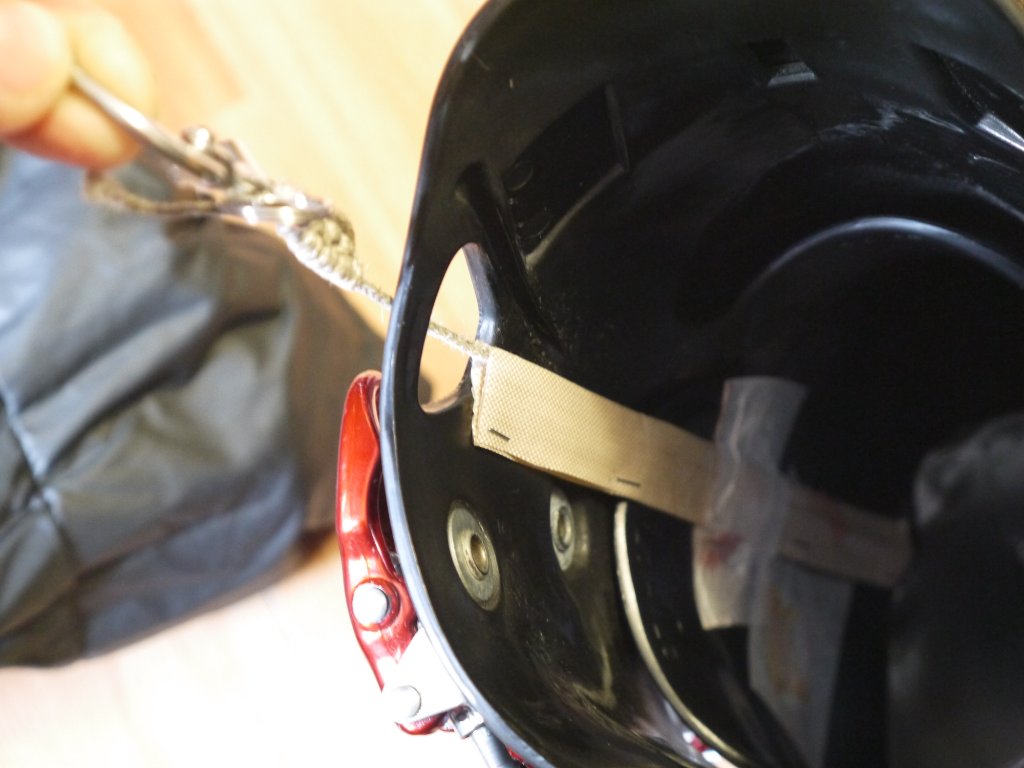 На конце стропички карабин. На штанах изнутри тоже стропа с петлей. А снаружи штанины хваталка. Пришитая сквозь штанину к стропе.