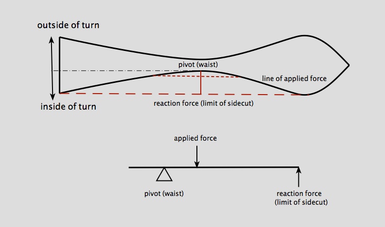 Если исключить силу и рассмотреть сферическую в вакуме доску и плотную поверхность, то при закантовке на угол N для контакта талии с поверхностью доску необходимо прогнуть до некоего минимального радиуса. Макс Петров помнится в свое время приводил простую формулу, что этот радиус пропорционален оригинальному умноженному на косинус угла закантовки. Т.е. при 60 градусах закантовки слаломка с 9 метровым моно-радиусом может поехать по радиусу не более 4.5 - иначе это не карвинг. Т.е. она должна при это быть изрядно прогнута.
