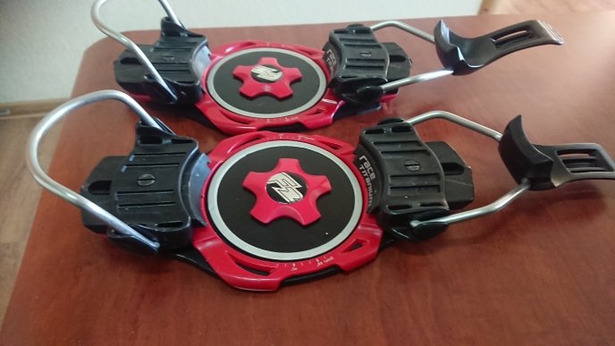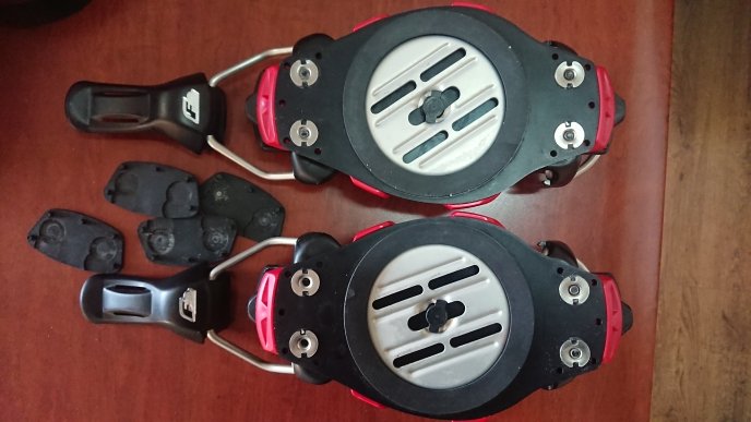 Крепы в хорошем состоянии. Разбирал, инспектировал - дужки, слайдеры, пистоны - все целое без трещин. Наклейки в комплекте нет. Лиш поищу, клиньев отсыплю, если надо. Катал сезон о общем. Мой размер все таки М.