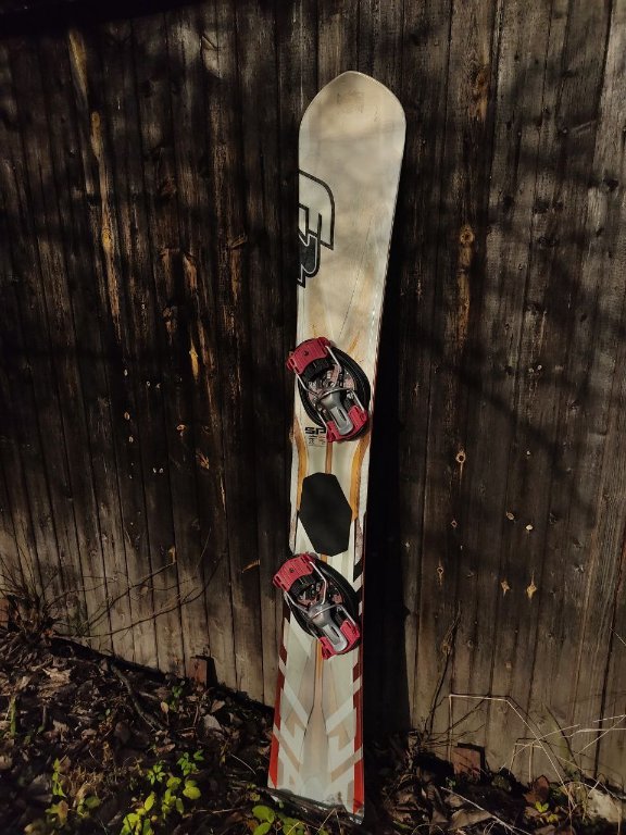 Доска 2007 года, олдскул, живая, с большим кембером. Имеет несколько несущественных царапин на скользяке, топшит в хорошем состоянии. В данный момент законсервирована (запарафинена), канты наточены. Катались много, в межсезонье бережно хранили.