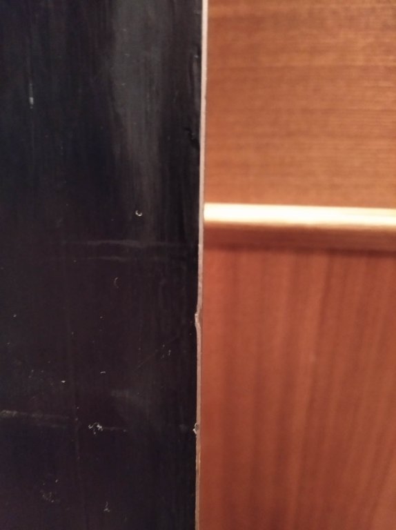 Уже довольно потрёпанный борд, но на склоне ещё показывает себя отлично. Из косяков: кантов в районе талии мало - всего 0.7-0.8мм (см. фото), есть 2-3 места чуть подмятых кантов (см. фото), скользяк под закладными местами выдавлен в виде выпуклостей.