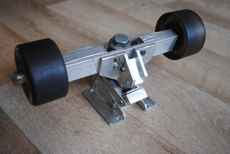 подвески стальные и тяжёлые, решил сделать облегчённую базу из алю-прифиля, да так оно и проще в домашних условиях, без фрезеровки, а с одной ножёвкой и дрелью. Имеется три положения в наклоне базы: среднее стандартное и два крайних(градусов по 15). Заодно решил заменить оси с 10мм на стандартные 8, благодаря удачному техническому решению получился ещё и модный оффсет.