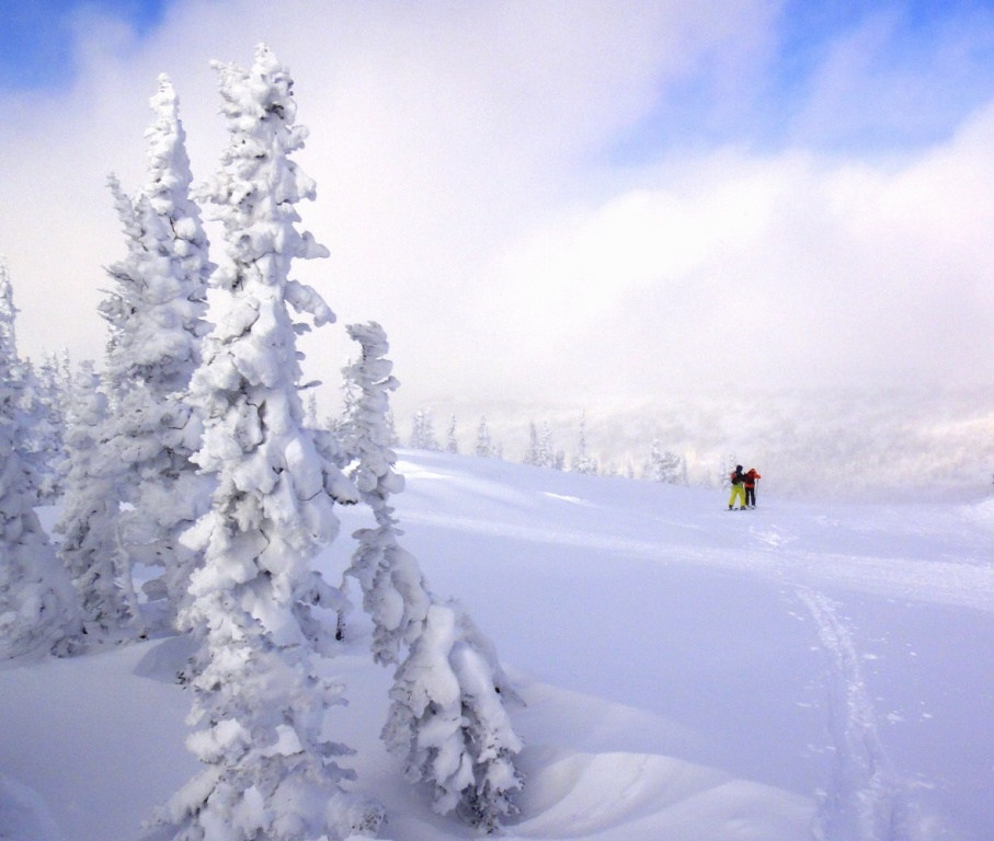 На горе всё было ожидаемо – в смысле неожиданно много снега!,очень много, столько не бывает! Все говорили что за последние годы попадали на такой снег первый раз! Все! Каталось всё и везде. Из за большого снега лес и курумник направо от хлебницы стали неинтересны – ходов не хватает,едешь по прямой и снег останавливает. Нужен уклон. Он есть в нужных местах. Там – просто праздник! Столько снежной пудры никогда не ел! Рот от счастья не закрывался! Идёшь по пояс-по грудь в снегу. Волны снега перекатываются через тебя. Как в фильмах в Канаде,Колорадо и прочих «мекках фрирайда». В остальных местах -лайтовое , комфортное катание. Но осторожность и внимательность всё же нужна – в лесу полно опасных ловушек: под камнями ,деревьями и в ручьях. Визуальный контакт всех членов группы, связь-рации у всех, следим-слушаем-помогаем в случае необходимости. Приходилось доставать из снежного плена здоровых мужиков – сами не могли выбраться- опоры нет,снег очень лёгкий, засыпает сверху после падения, проваливаешься очень глубоко, порой было жутковато. К деревьям не подъезжаем, камни и ручьи проходим ходом чтобы приземление было подальше. Иначе – опускаешься в яму под камень или в глубокое русло ручья. Снега было столько что даже не выезжали в этот раз никуда на ратраке – хватало катать рядышком. Все дни с 22 по 28 ноября катали, несмотря на мороз и ветер - дорвались «как голый до бани»!