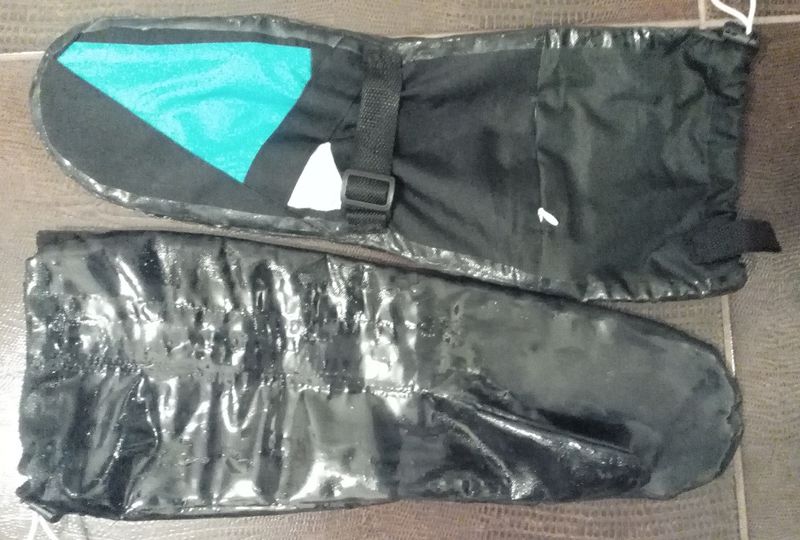 Немного видоизменил раскройку, размер сделал побольше, под толстую перчатку на руку, длину до локтя. Решил снизу резинку не делать, чтоб поменьше складок. Дополнительно с целью убрать гибкость материала на нижнюю деталь пришил велкро.Материал - оксфорд (полиэстер 600Д). Он слегка плотнее, чем приятные на ощупь Gore-tex и иже с ними, из чего шьют варежки. Чую, прочность его избыточна... Оксфорд лежит в магазинах, материалы получше не знаю как заказывать...