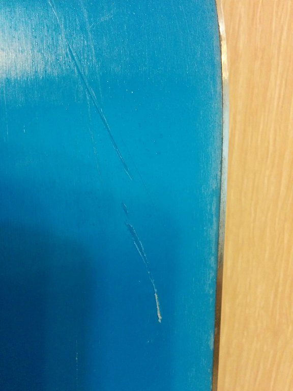 Комплект был катан ~15 раз на местных пупырях, парафинился 2 раза, канты не точились. Катался аккуратно, но есть маленькая царапка на скользяке (на фото получилась большой). На данный момент доска требует парафинку.