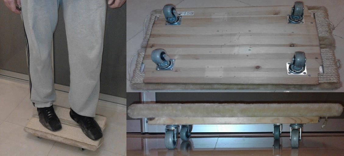 В "оригинале" вместо колесиков была невысокая вертикальная планка (сантиметров в пять в высоту, сантиметр в ширину), прикрепленная снизу по центру горизонтальной доски (размером около 40 на 40 см.). Этакая буква Т с широкой полкой-доской и невысокой палкой-планкой. Задача "лыжника" была в том, чтобы, балансируя на доске, максимально накренить доску то в одну, то в другую сторону, при этом не касаясь пола краем доски. Таким образом тренировался продольный баланс (если ступни "лыжника" стоят на доске перпендикулярно вертикальной планке) и поперечный баланс (ступни паралельны планке). Были даже фотографии "продвинутого" использования тренажера - тренеры быстро катили телегу (наподобии тех, на которых развозят ящики в супермаркетах) по неровному полу, а на телеге спортсменка делала "перекантовки", стоя на таком "тренажере".